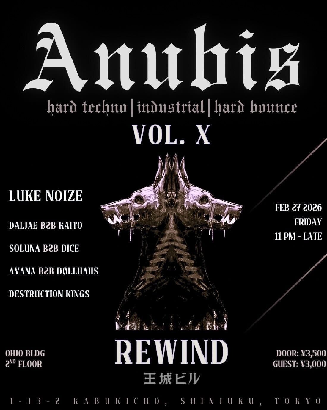 PICKUP 0 Stars FRI, 27 Feb 2026ANUBIS X - REWIND @ 王城ビル / OHJO BLDG. / TOKYO, JAPAN Techno Luke Noize/DALJAE