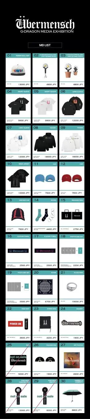G-DRAGON が取り組んだ、自身初となるメディアアートの展示。G-DRAGON の 3rd 正規アルバムに込められたメッセージ「Übermensch(超人)」を、最新のデジタルメディアアートで表現したもの。2025年3月韓国・ソウルの「ザ・現代ソウル」で初めて開催された本展示は、わずか10日間で55,000人以上を動員。 SNS を中心に大きな話題を呼び、現地では "次世代メディア展示" として高い評価を受けた。そんな「G-DRAGON Media Exhibition : Ubermensch」の展示とともに全世界11か国を回ってきたオフィシャルグッズが、渋谷に勢揃いする。■ 商品の一例