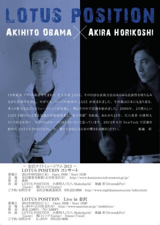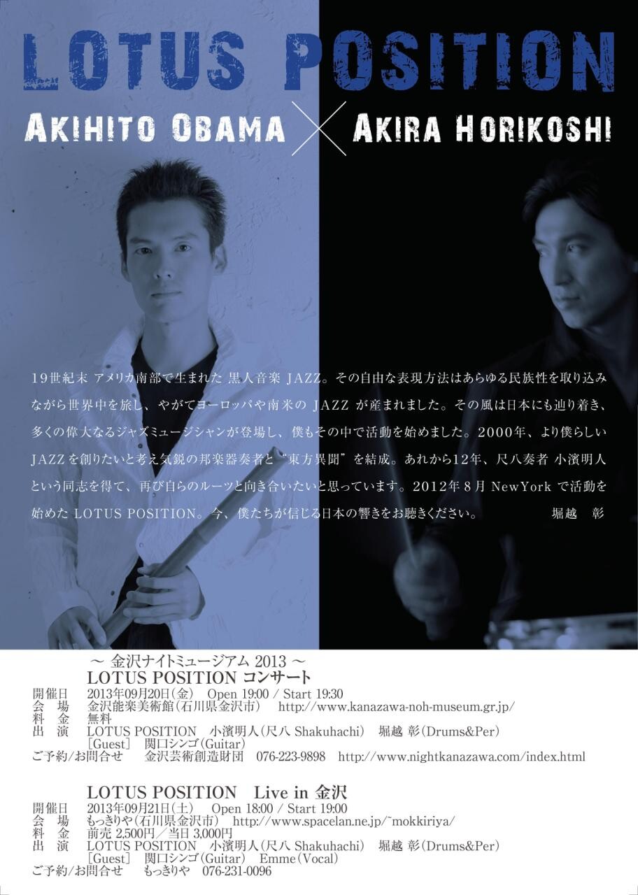 出 演 者 LOTUS POSITION=小濱明人(尺八)・堀越彰(Ds.)/ゲスト=関口シンゴ(G.)・Emme(Vo.)