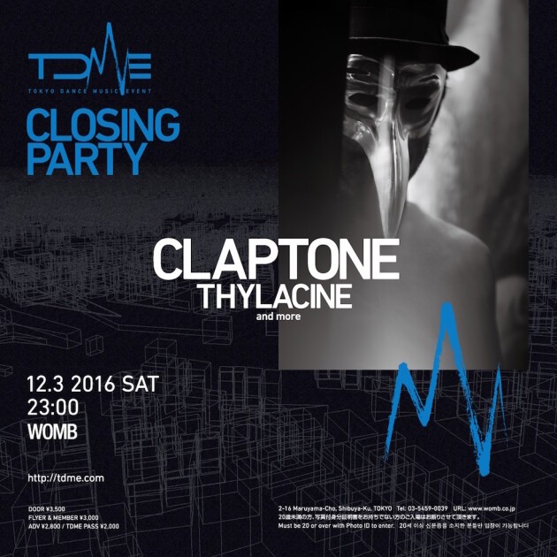 At the TDME CLOSING PARTY to be held on December 3rd (Sat.) at Shibuya WOMB, CLAPTONE, the masked artist conquering the modern world dance music scene and listed by Beatport as a BEST SELLING DEEP HOUSE ARTIST, will make his first appearance in Tokyo. And, French new generation artist THYLACINE will also be added to the bill. Don't miss this live performance, with a high degree of perfection that seeks to make you dance!