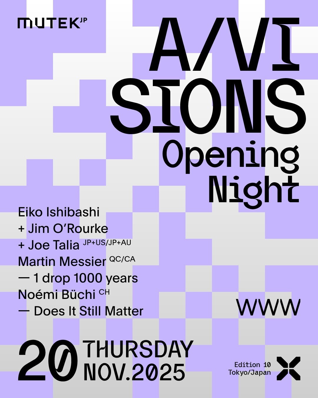 MUTEK.JP 2025は、11月20日(木)渋谷WWWで開催されるオープニングプログラム、A/Visionsで幕を開けます。カナダ・モントリオールを拠点に活動するメディアアーティスト、マルタン・メシエが新作『1 drop 1000 years』を披露。音・光・動きを融合し、地球の海流システムや気候変動の影響を題材にした没入型オーディオビジュアル・パフォーマンスを展開します。チューリッヒ拠点の作曲家/サウンドアーティストNoémi BüchiによるイマーシヴなAVショー『Does It Still Matter』のアジア初演。さらに、ジム・オルーク、石橋英子、ジョー・タリアによるトリオが、エレクトロアコースティックなサウンドスケープとドラムが交差する、実験的なインプロヴィゼーションを繰り広げます。音楽とデジタルアートにおける実験的なアプローチに触れられる一夜となるでしょう。