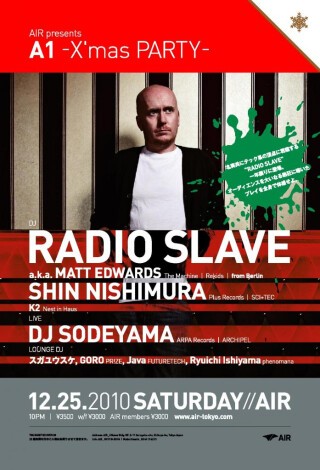 AIRにおける新たなテクノ/ハウスミュージックの本拠として立ち上げられたパーティ“A1”。2010年最後の開催にフィーチュアされたのは、昨年末もAIRのオーディエンスを大いなる熱狂に導いてくれたRADIO SLAVEだ。危険なアンダーグラウンド・マッシュアップシリーズや、Paul McCartney、Kylie Minogue等のリエディットで一躍その名を世に知らしめ、Rekid名義でSoul Jazzからリリースしたシングルがクロスオーヴァーヒットしたことをきっかけに、一気に世界のトッププロデューサー入りを果たした旬のアーティストである。いまや名実共にテック系の頂点に君臨する彼のプレイとSHIN NISHIMURAそしてLIVEセットで参戦するDJ SODEYAMAとの至福の音空間を、全身で体感せよ。