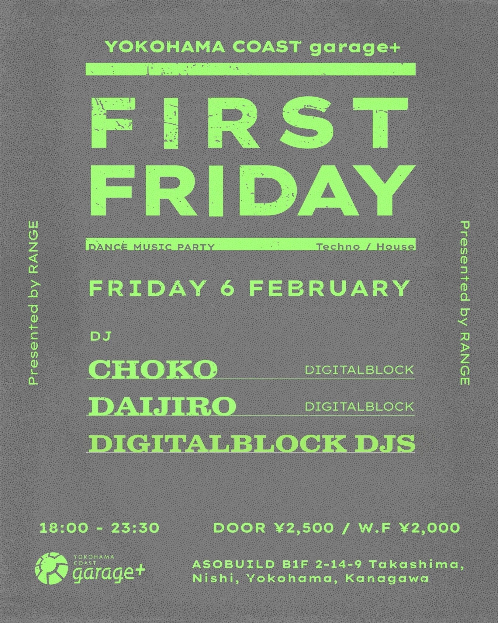 0 Stars FRI, 06 Feb 2026RANGE presents. "FIRST FRIDAY" feat, DIGITALBLOCK @ YOKOHAMA COAST Garage+ / KANAGAWA, JAPAN TechnoHouseTech House CHOKO/DJ DAIJIRO