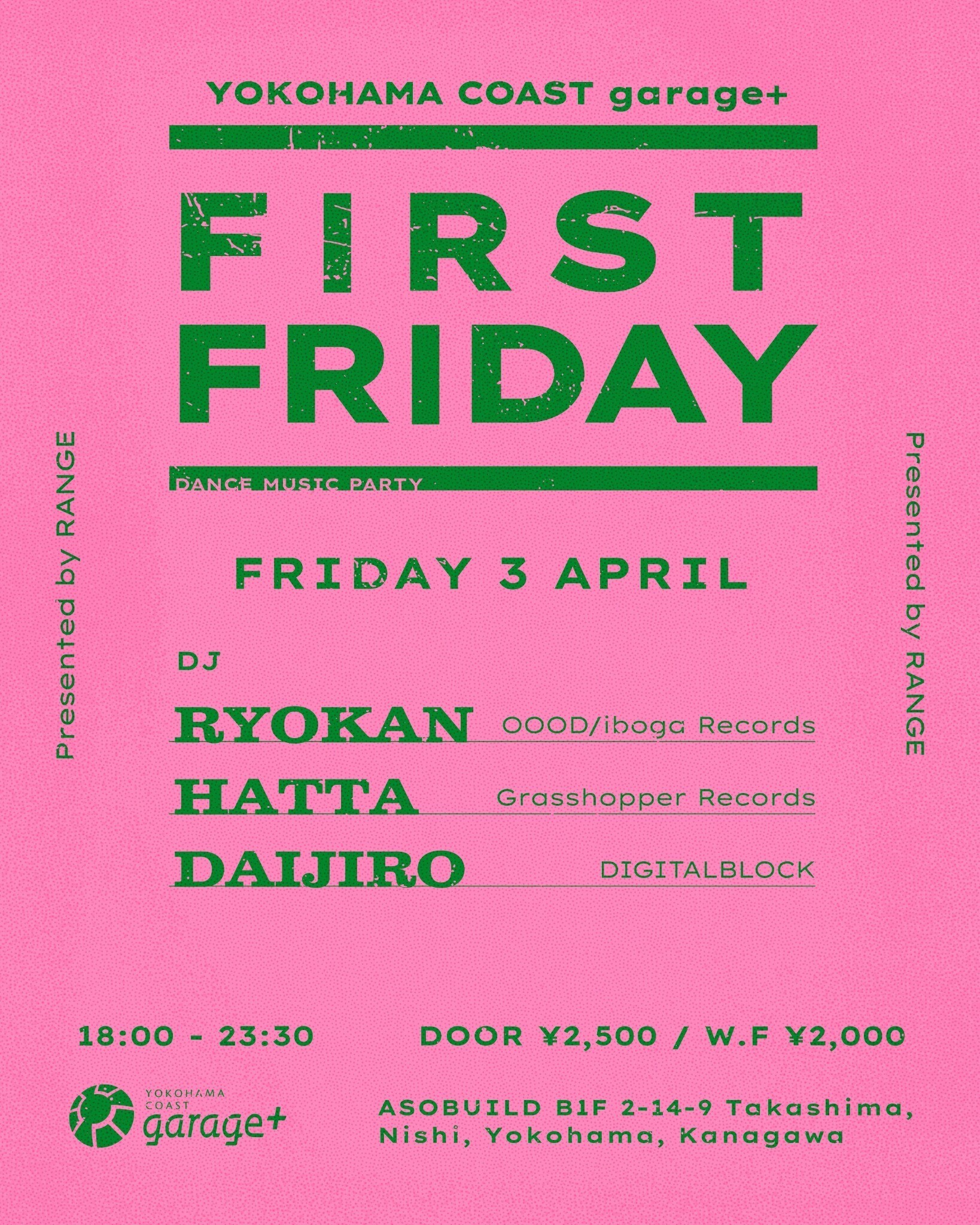 0 Stars FRI, 03 Apr 2026RANGE presents "FIRST FRIDAY" #03 @ YOKOHAMA COAST Garage+ / KANAGAWA, JAPAN PsychedelicTranceElectronic RYOKAN OOOD/HATTA/DJ DAIJIRO