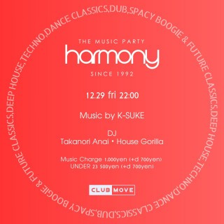 12月のHARMONYは2021年にCLUB KUMANOやARKUDA LABELでの活動、またMOVEにて "HOUSE MUSIC ALL LIFE LONG" をオーガナイズし現在は東京を中心に活動中で90年代のHOUSE好きな "House Gorilla" がプレイします。