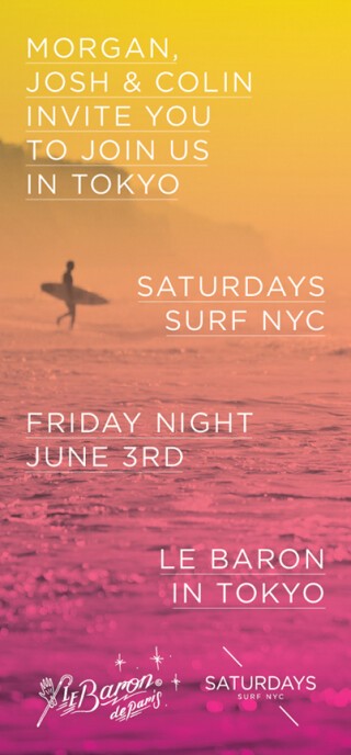 彼らの居る場所。それはカリフォルニアでもなければマイアミでもない。穏やかな運河の向こうにニュージャージーを望むマンハッタン。この街唯一のサーフショップSATURDAYS SURFのオーナー3人組、モーガン、ジョッシュ、コリンが念願の初来日。運河に囲まれた街マンハッタンでサーフショップを開く。これこそギミックが効いた最高のアイディア!BURTONから佐藤崇、THE NORTH FACEから小口大介が参戦する、ボーダレスなボードナイト。今夜、世界が注目する都市ボーダーという新形態を体感してほしい。