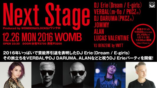 2016年いっぱいで芸能界引退を表明したDJ Erie(Dream / E-girls)その旅立ちをVERBALやDJ DARUMAなどと祝うパーティを12月26日(金)WOMBで開催!GENERATIONS from EXILE TRIBE/EXILEの白濱亜嵐もDJとして出演決定! もっと読む …